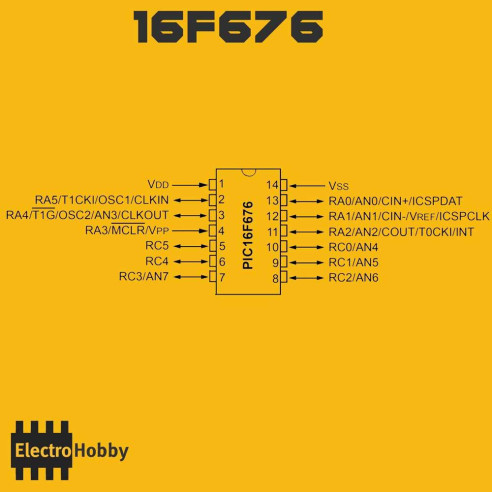El PIC16F676 se presenta en un encapsulado de 14 pines, lo que lo hace compacto y fácil de integrar en diversos diseños. A continuación, se detalla la configuración de pines y sus funciones: